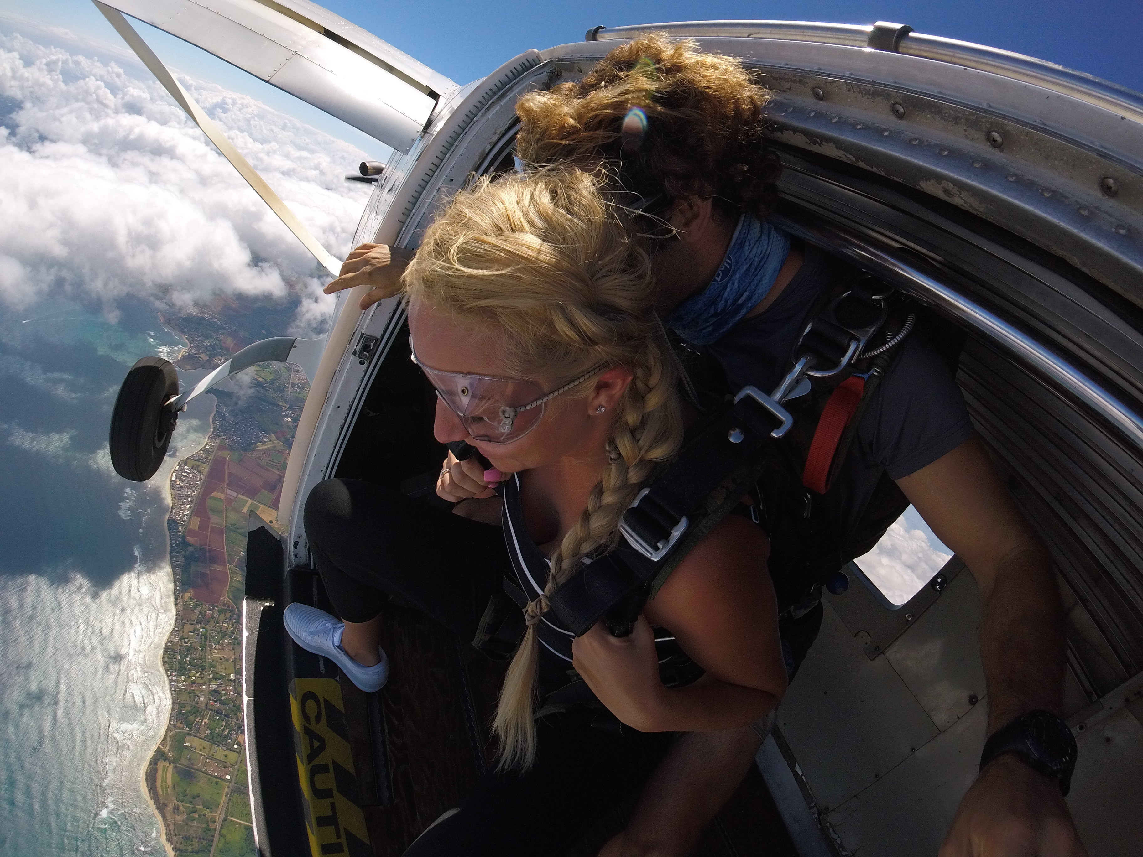 A 30 minute wait and it was our turn. We had 6 jumpers per plane and all of the instructors were lovely and very experienced. We hopped in the little plane and took off up to 14,000ft above Oahu. The view was amazing! It wasn’t too long before we were above the clouds and the ocean- which kind of freaked me out, before the instructors all got excited and within 1 minute I found myself in the doorway of the plane looking out on the world like a bird.